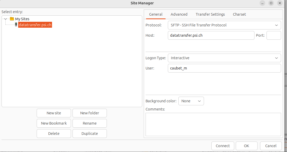 One can simply use the FileZilla to transfer data from/to outside PSI. It's important to setup MFA for the connection. To do this, one has to go to the menu File -> Site Manager and create a new endpoint (new site), as follows: